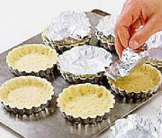 2. The unbaked shell is lined with foil or parchment paper, then filled with dried beans or rice, clean pebbles (a French