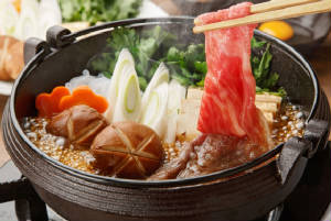 marmite spéciale en fonte, appelée sukiyaki-nabe, est placée au centre de la table avec la sauce warishita. Chacun fait cuire les aliments de son choix dans la marmite puis les trempe dans un petit récipient